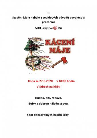 Sbor dobrovolných hasičů Srby Vás zve na Kácení máje v sobotu 27.6. od 18 hodin na hřišti.
